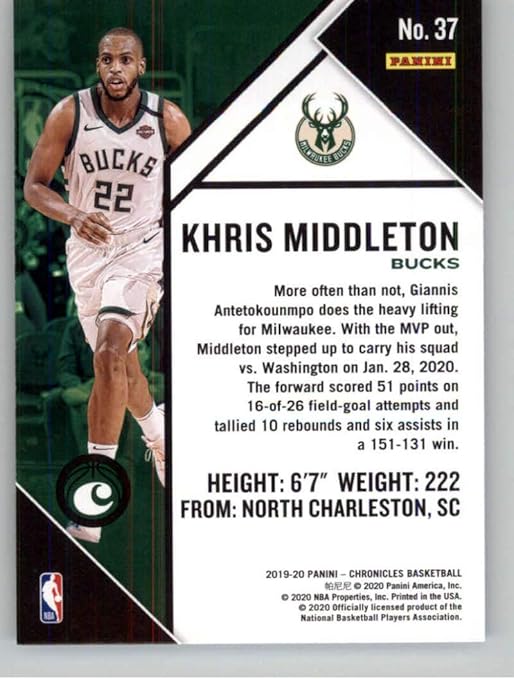 Amazon Com 2019 20 Panini Chronicles 37 Khris Middleton Milwaukee Bucks Nba Basketball Trading Card Collectibles Fine Art
